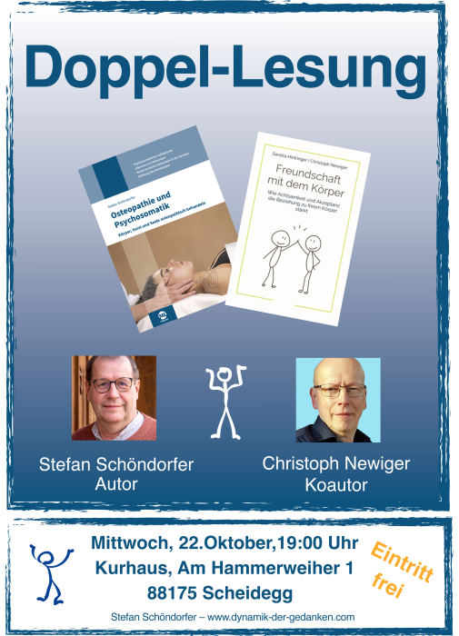 Freuen Sie sich auf Koautor Christoph Newiger, der aus seinem neuen Sachbuch "Freundschaft mit dem Körper" lesen wird. Zudem wird Autor Stefan Schöndorfer Einblicke in sein Buch "Osteopathie und Psychosomatik" geben.